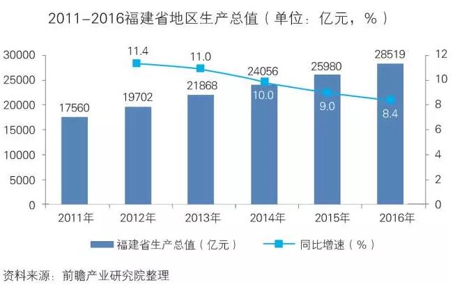 福建省在2011到2016年GDP呈上升趋势且增速较快,为体育发展事业提供了坚实基础,有利于体育产业的发展。2016年,福建省地区生产总值达到28519亿元,同比增长8.4%。